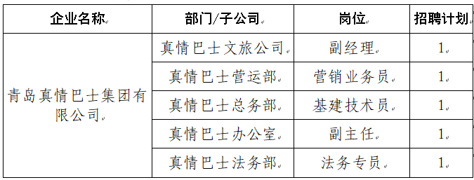 为满足集团业务发展需要,青岛真情巴士集团有限公司现面向社会公开招聘工作人员5名,具体招聘公告如下: