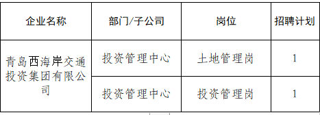 为满足集团业务发展需要,青岛西海岸交通投资集团有限公司现面向社会公开招聘工作人员2名,具体招聘公告如下: